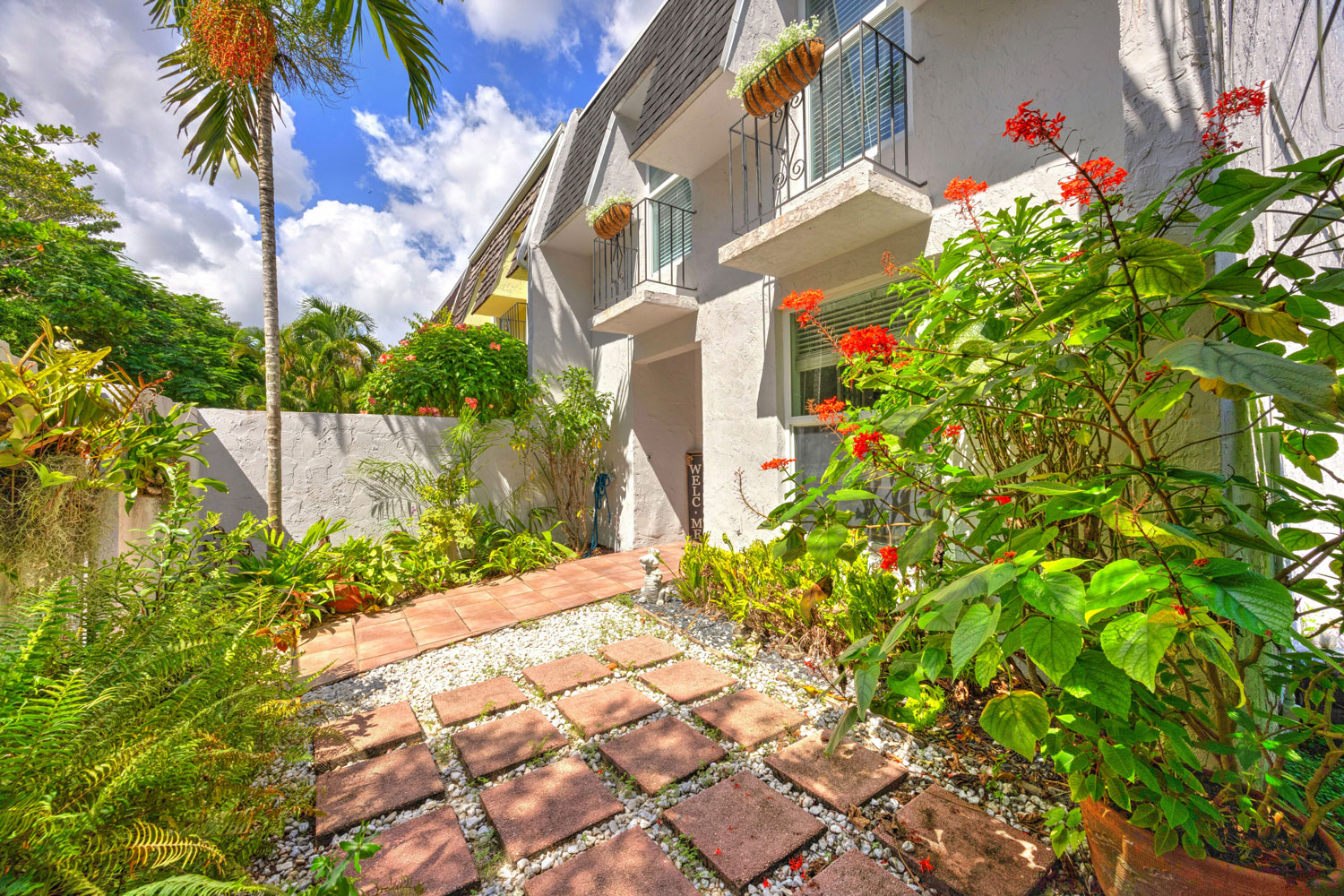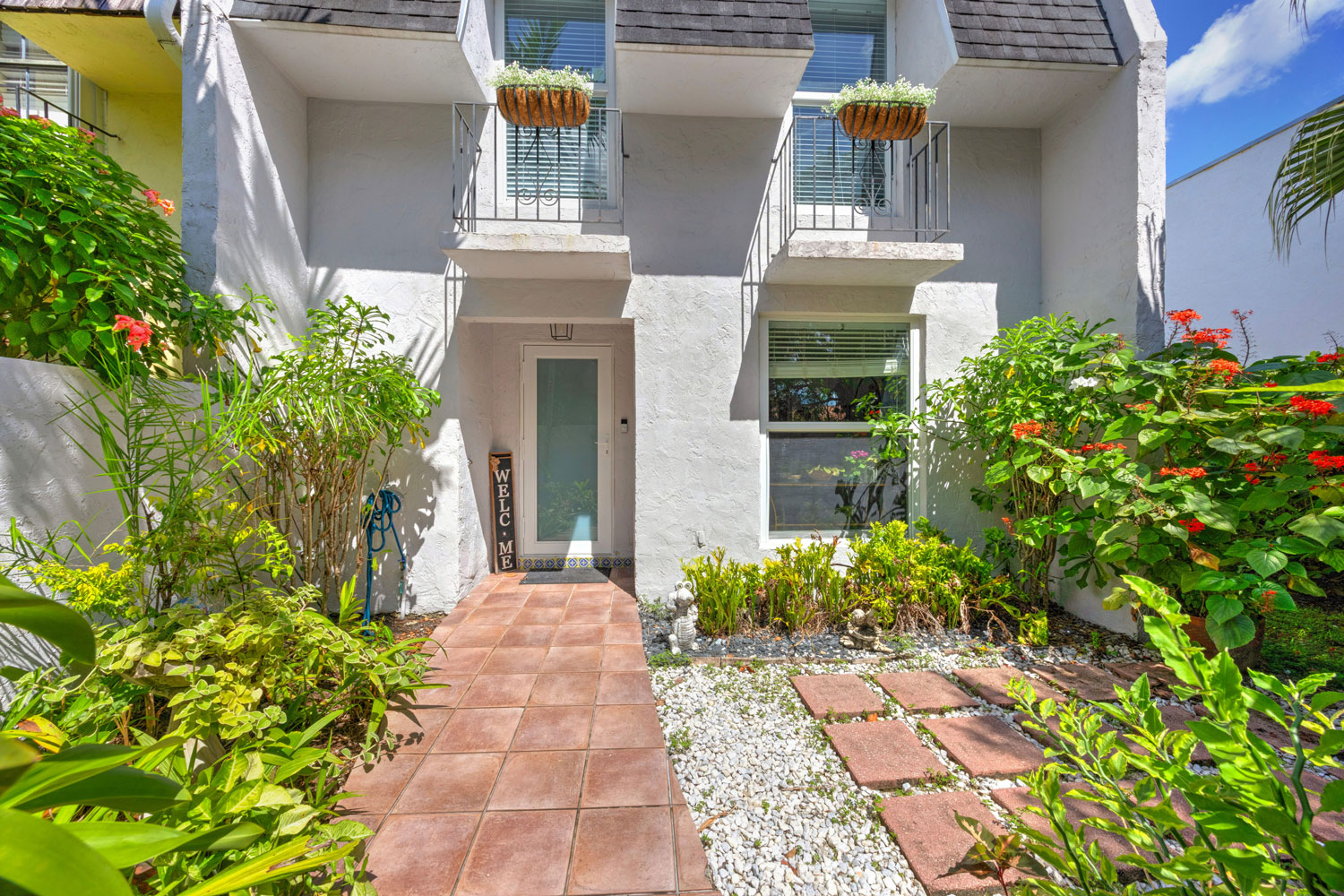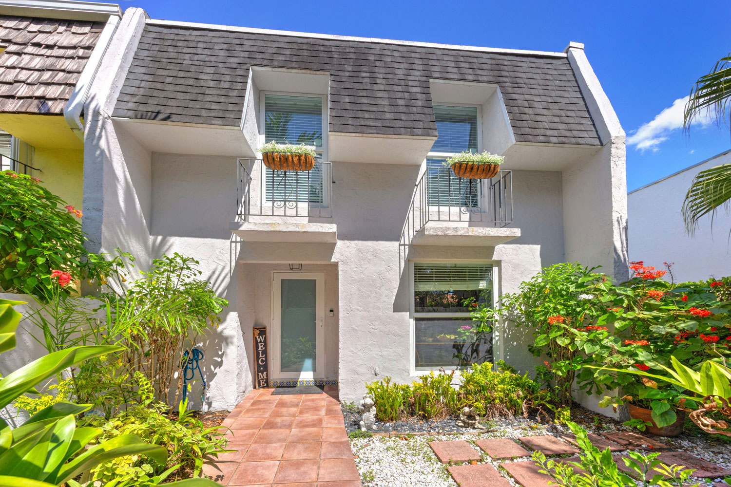 Upstairs, you'll find two large bedrooms with superbly updated en-suite bathrooms including a gracious balcony off the primary bedroom. As a corner unit, it offers the added benefit of a front, side and back gated yard. Other notable features include impact windows & doors throughout, a newer roof, plenty of parking spaces, a large covered back patio, & a dedicated laundry room. Must See!